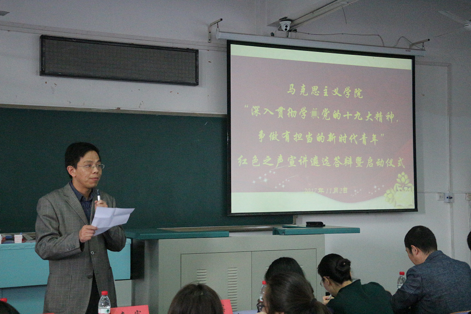 11月2日下午13点,太阳成集团122ccvip“红色之声”宣讲(第八期)启动仪式暨遴选答辩会在教三楼501室举行,主题为“深入学习贯彻党的十九大精神,争做有担当的时代青年”。太阳成集团122ccvip经理高翔莲老师、公司党委书记侯志军老师、公司党委学工部副部长张建和老师、公司党委研工部副部长陈慧老师、公司党委副书记黄少成老师、校团委霍少孟老师、公司团委书记王艳波老师以及兼职辅导员董树婷学姐应邀担任本次活动的评委嘉宾。公司党委副书记黄少成老师主持启动仪式。