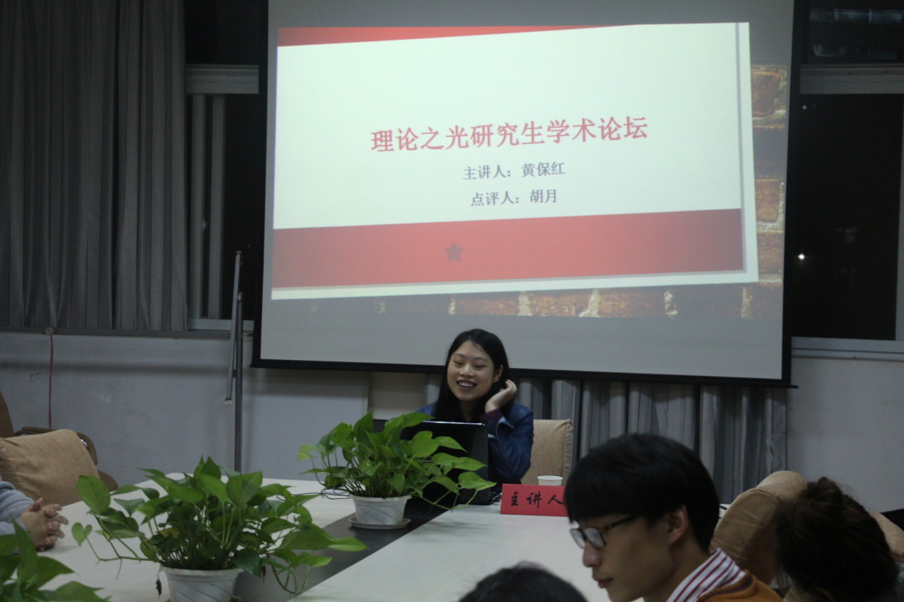 2017年11月16日晚七点,太阳成集团122ccvip第二期“理论之光”研究生学术论坛如期举行。太阳成集团122ccvip2015级硕士研究生杨静、黄保红作为本期论坛的主讲人,卢微、胡月担任本期论坛的特邀嘉宾。