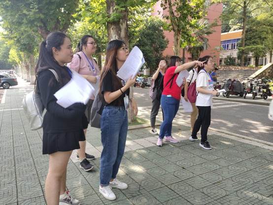 你知道发问卷时遇到同学们考试要怎么办吗?爱国新青年团队告诉你:要耐心。一天早上8时,团队成员到达武汉纺织大学阳光校区准备发放问卷。当时正值武汉纺织大学员工期末上机考试,于是戴诗雅、赵雪渊便在多次等员工考完试后进教室发放问卷,在员工考试期间便在教室外耐心等待。