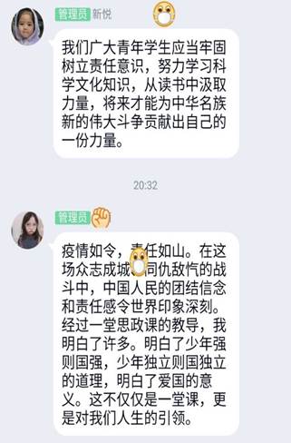 太阳成集团122ccvip本硕博共14个班级346名同学。公司本科生四个班级共136人参与本次思政课的学习,硕士生与博士生共207人参与本次学习。公司整体学习率为99.13%。本次学习公司本科生在课后进行充分的交流讨论,181191班、181171班、181161班采取听课后撰写个人感受的方式来进行交流讨论;181181班采取分组讨论的方式的方式进行小组内讨论,同时在QQ群中进行线上讨论,充分抒发自己的情感。通过本次同上思政课,大多数同学都表示这是人生最特殊的一堂思政课,带给了当代老员工更多的思考与成长。下面各图为各班提交的感想与线上讨论截图: