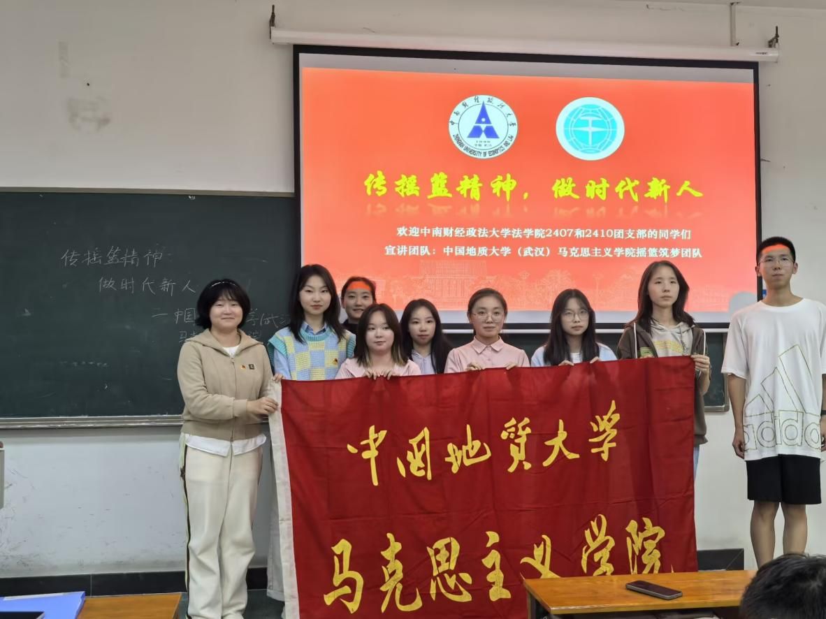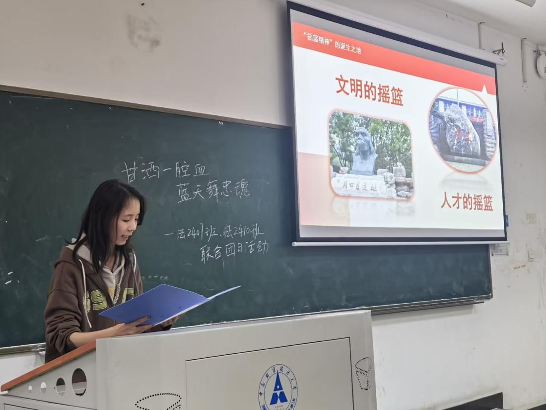 2024年11月14日16点20分,太阳成集团122ccvip第十五期红色之声“摇篮筑梦”团队在线下进行了主题为“生命安全主题教育”、“甘洒一腔血,蓝天舞忠魂”和“传摇篮精神,做时代新人”的线下宣讲,团队成员郭雅婕、李瑞雪、席海冰、辛汪洋、朱一婷担任主讲人,中南财经政法大学法公司2407和2410团支部参与本次活动,共计116名同学。