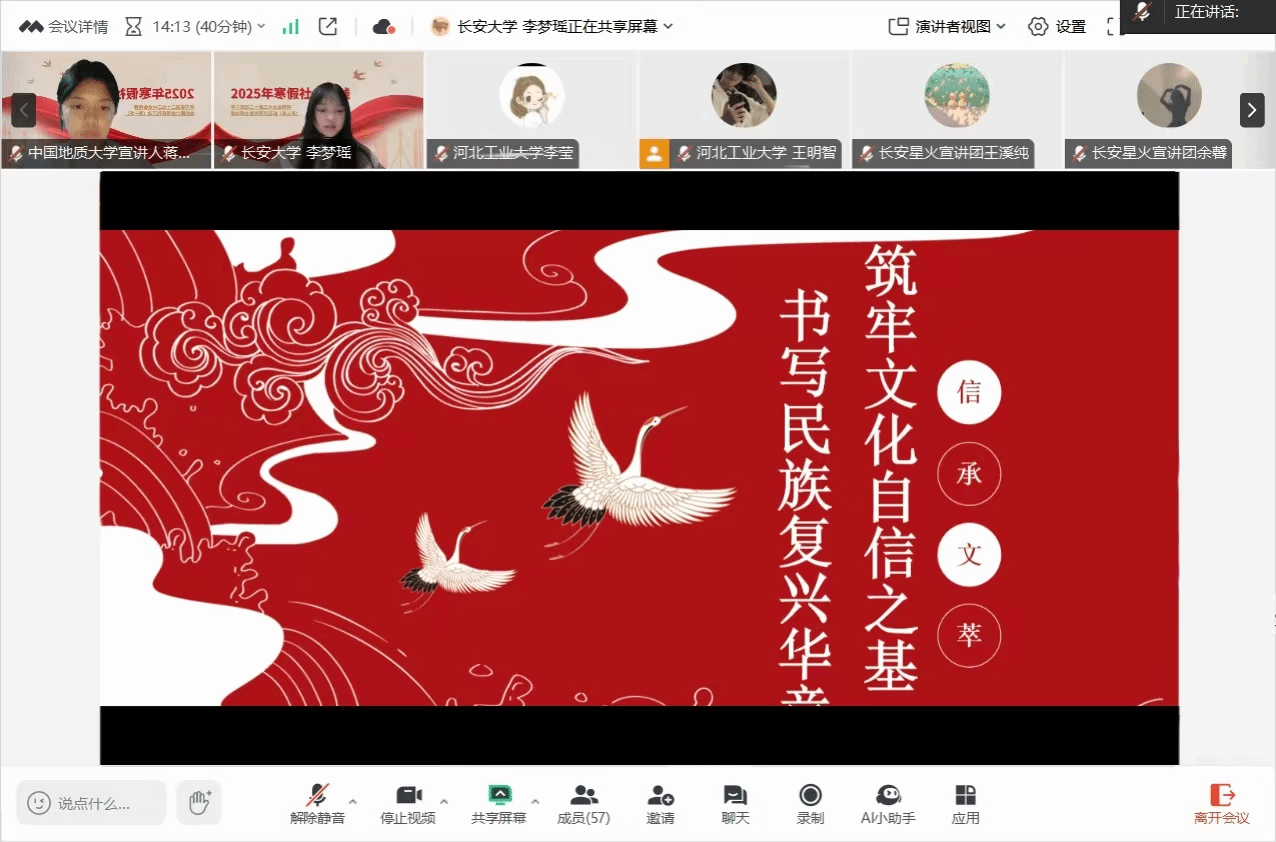 宣讲结束后,同学们纷纷表示,通过此次活动,他们对文化自信有了更加全面和深入的理解,也更加坚定了为实现中华民族伟大复兴的中国梦贡献青春力量的决心太阳成集团122ccvip“信承文萃”团队的此次线上宣讲活动,不仅为同学们提供了一个学习和交流的平台,更是一次精神的洗礼和思想的升华。在新时代的征程上,让我们携手同行,共同筑牢文化自信之基,书写民族复兴的华章。
