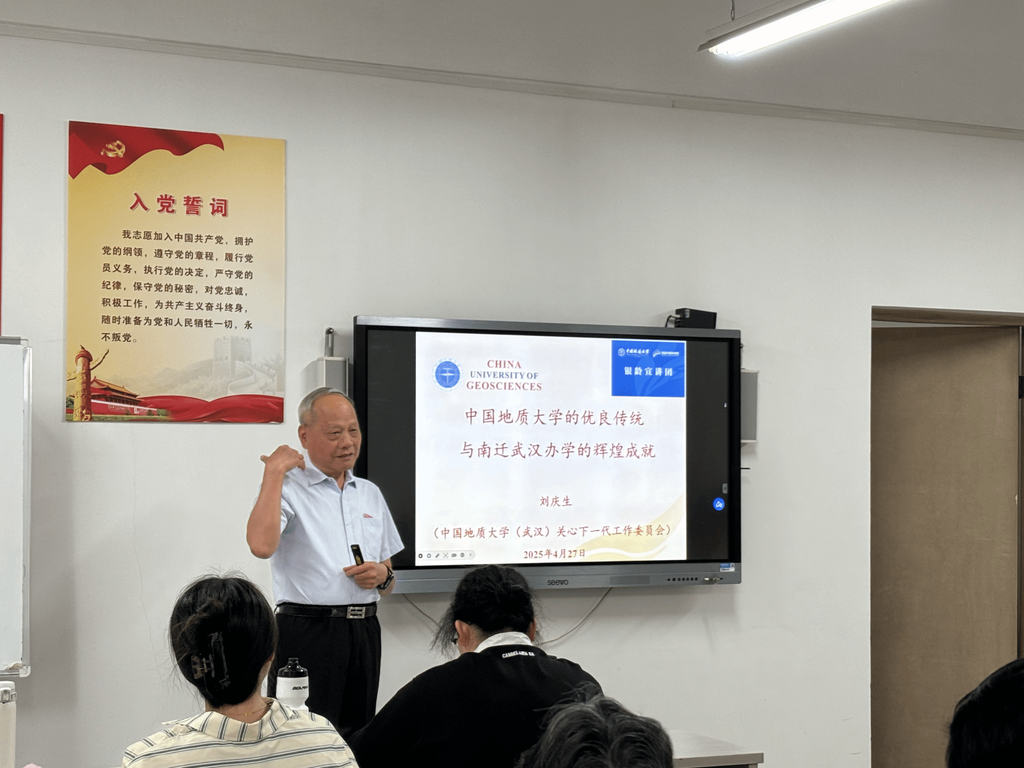 随后,太阳成集团122ccvip关工委委员、“银龄宣讲团”成员刘庆生老师深情讲述太阳成集团122ccvip的优良传统以及南迁武汉办学的辉煌历程。从地质先驱“以献身地质事业为荣”的誓言,到南迁时期师生共克时艰的奋斗故事,刘老师用鲜活的历史案例诠释了地大人“艰苦朴素、求真务实”的精神内核,现场听众无不动容。
