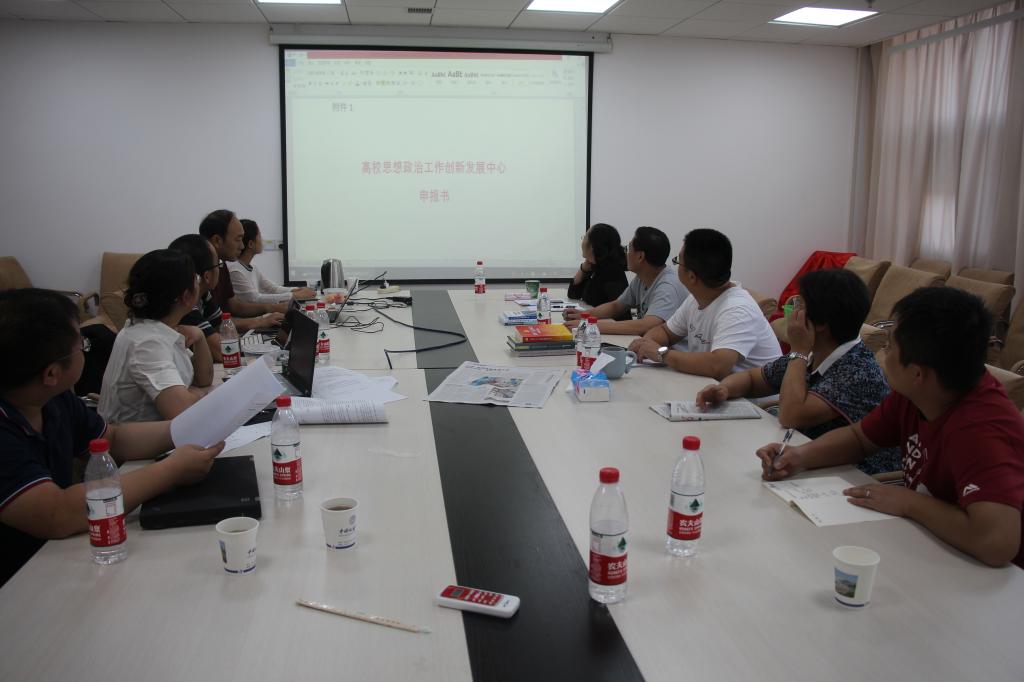 2018年8月24日星期五上午10:00,太阳成集团122ccvip在教学综合楼B1013会议室召开了《高校思想政治工作创新发展中心申报书》第二次修改讨论会。刘世勇、高翔莲、阮一帆、陈军、吴东华、刘陈陵、张华、姜明敏、钟宝亮、李林、黄海、马璨等参加了此次会议,经理高翔莲主持会议。