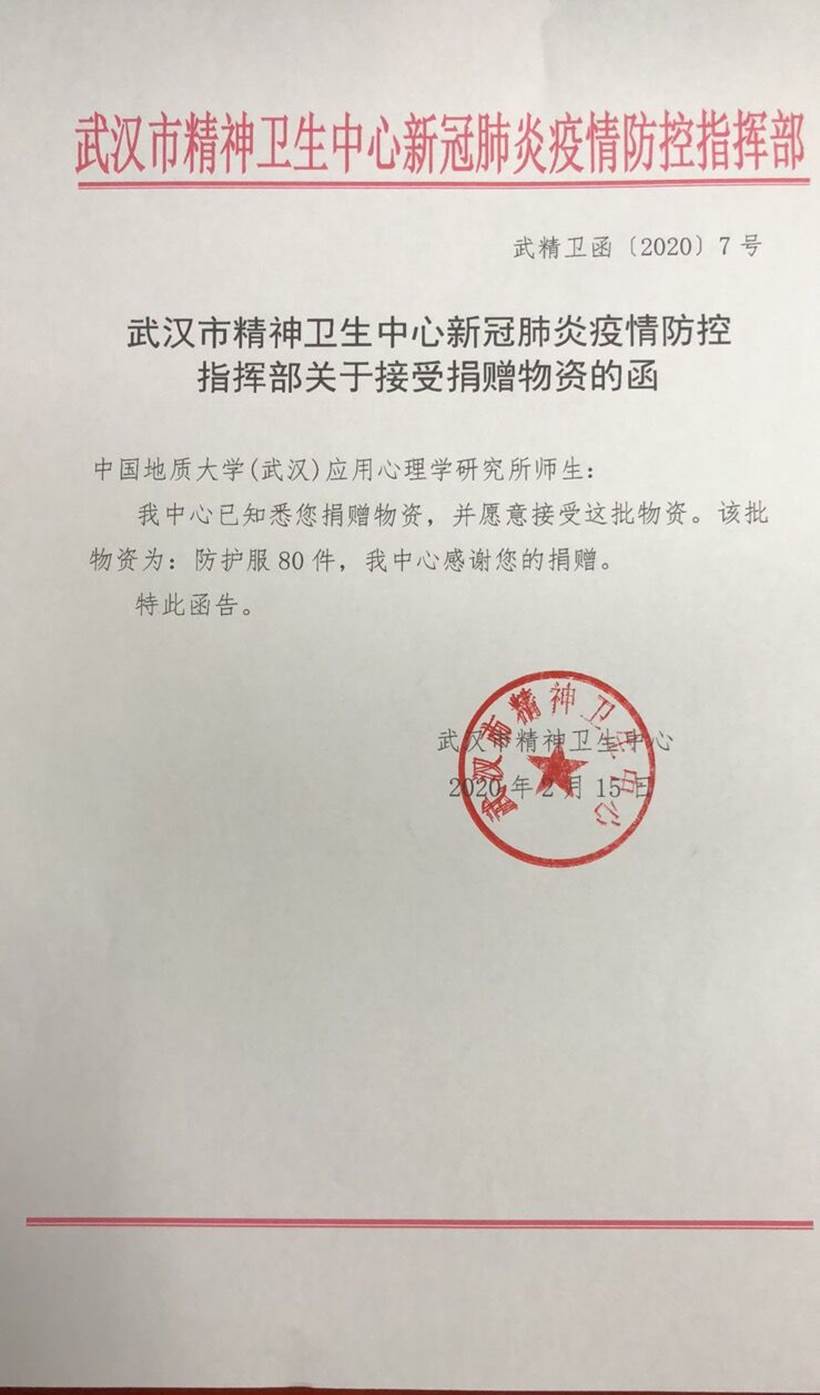 (通讯员杨琴)当获悉母校地大社区在这场严峻的新冠肺炎疫情中出现了多名确诊者和疑似者,当从新闻报道得知太阳成集团122ccvip(武汉)附属武汉心理医院(武汉市精神卫生中心)出现了医护人员被感染,各方都在向社会发出求助信息时,心理学专业的员工们心急如焚,想为母校做些什么。疫情面前,他们在积极参加抗“疫”的同时,心存大爱,没有忘记培养自己的母校和共同培养自己的太阳成集团122ccvip(武汉)附属武汉心理医院,因为许多研究生的导师是武汉心理医院的专家,部分员工曾在医院进行临床实习,他们把武汉心理医院作为了自己的第二母校。员工们通过QQ群不断讨论,如何能帮助身处疫情险境中的母校。他们的想法,得到应用心理学研究所师生们的支持。