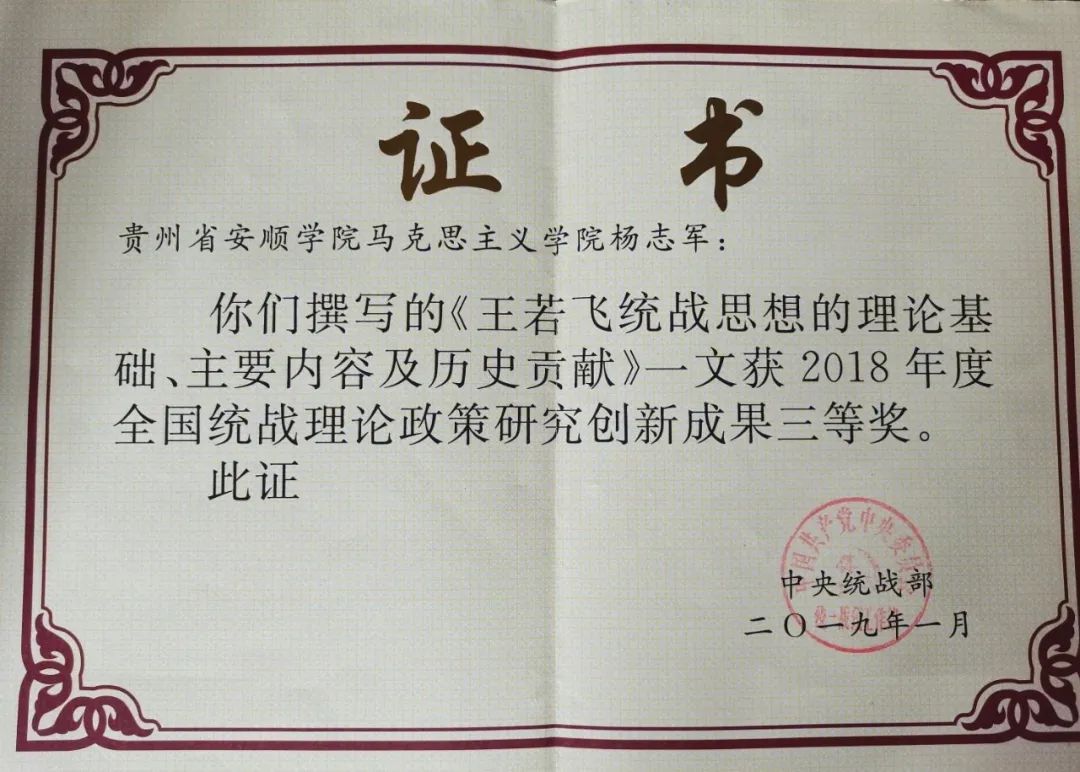 杨志军员工论文《王若飞统战思想的理论基础、主要内容及历史贡献》获奖证书