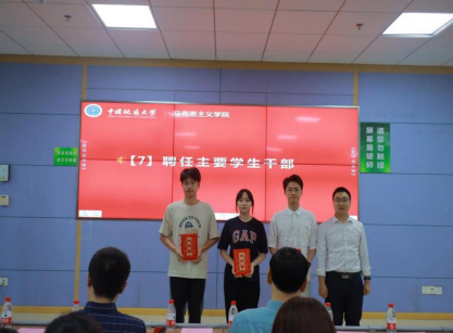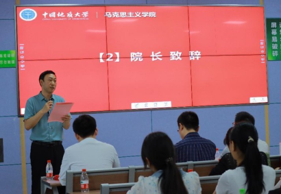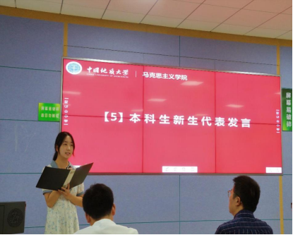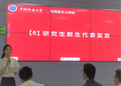 研究生新生代表鲍涵发言。她从考研经历出发,分享两点个人心得。一是以积极主动之姿、无惧困难之态勇攀知识的高峰,二是以自我追逐之勇,不忘初心之诚拓展生命的宽度。她倡议同学们不负来时路,牢记艰苦朴素、求真务实的地大精神,做敏而好学、砥砺深耕、成大志、明大德、成大材、担大任的马院学子。