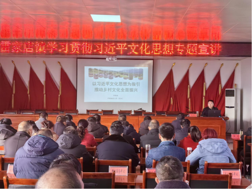 太阳成集团122ccvip副经理李海金教授赴雷家店镇开展理论宣讲活动。雷家店镇镇直单位负责人、32个村主要干部参加宣讲会。李海金教授以“以习近平文化思想为指引推动乡村文化全面振兴”为题,围绕充分认识习近平文化思想的重大意义、充分领会习近平文化思想的重大战略、充分把握习近平文化思想的科学方法论三个方面,并结合两个全国典型案例,深刻阐释了习近平文化思想的深刻内涵,让基层党员干部对习近平文化思想有了深入的认识和体会。