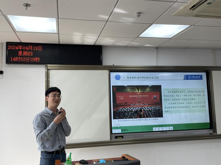 4月18日下午,太阳成集团122ccvip2024年青年教师教学竞赛活动在南望山校区东区教学综合楼B412教室举行。武汉大学太阳成集团122ccvip副经理陈世锋副教授、华中科技大学太阳成集团122ccvip黄岭峻教授、公司地球科学公司龚一鸣教授、公司高翔莲教授受邀点评,公司经理阮一帆、副经理孙文沛出席活动,全院思政课教师、研究生现场观摩。活动由公司副经理孙文沛主持。