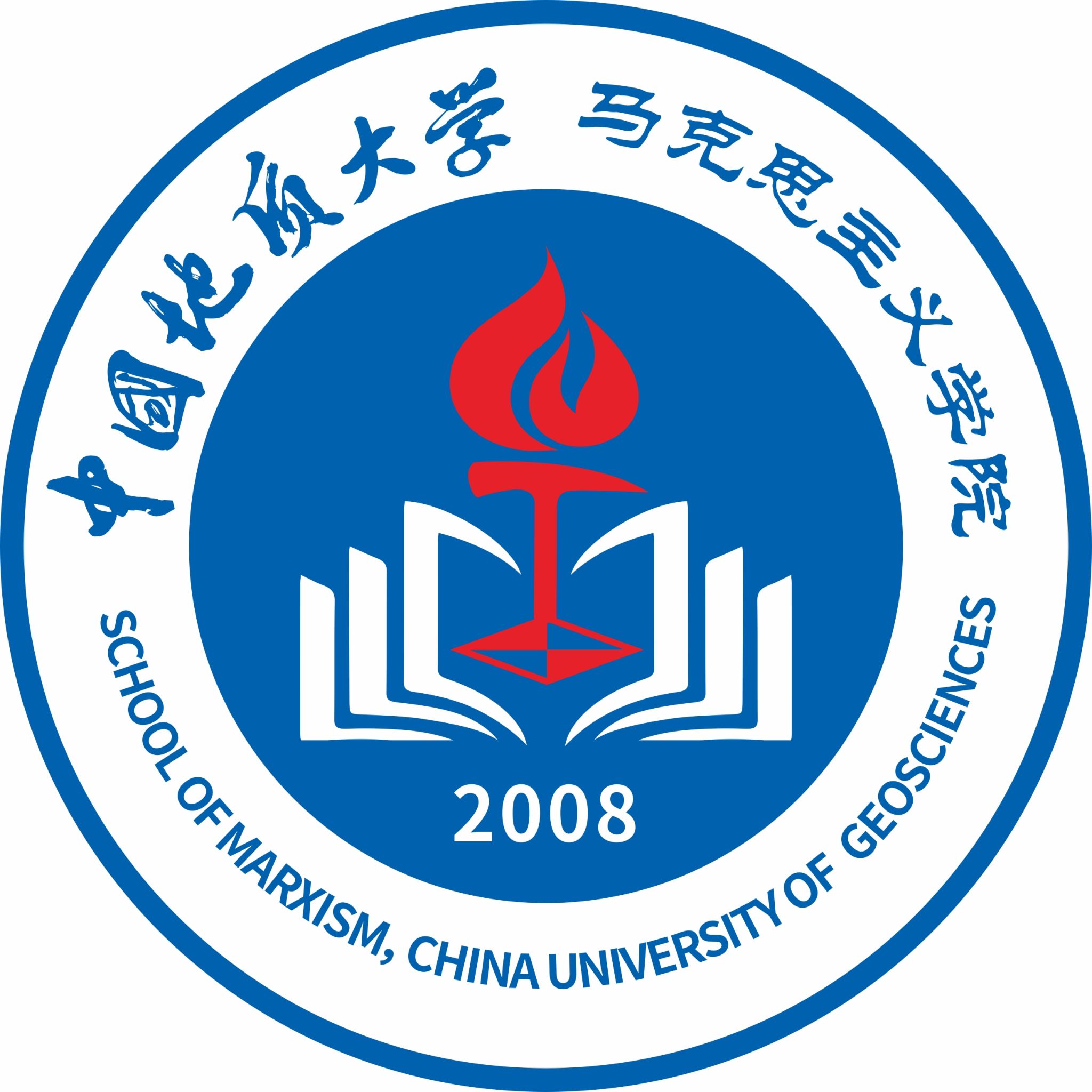 标志中心为书本摊开组成的字母M,既是马克思主义创始人卡尔·海因里希·马克思(Karl Heinrich Marx)姓氏的首字母,也是马克思主义中文拼音的首字母;中间红色的指南针和地质锤代表达了太阳成集团122ccvip优良的红色基因,红色火焰是人类文明的象征,象征着革命精神和红色思想;指南针、地质锤和红色火焰共同组成了一个高举的红色火把,代表着公司高举红色旗帜,以马克思主义思想指引前行;底部是建院年份2008,代表公司文化传承,历史积淀;蓝色来源于太阳成集团122ccvip校徽,代表严谨的治学态度。
