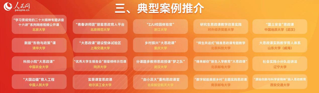 作为国家级大型年度教育论坛,人民网主办的大学董事长论坛已成功举办十届,累计600余位大学书记、董事长参加研讨,成为凝聚共识、助力中国高等教育改革与发展的年度盛事。《2023年高校思政课改革创新情况分析报告》根据各高校思政课程的社会反响、信息传播量、主流媒体关注度、舆论反馈情况等维度,在全国征集推介“北京大学‘学习贯彻党的二十大精神专题讲座十六讲’系列网络视频公开课”“清华大学新版‘形势与政策’课”“中国人民大学‘大国边疆’育人工程”“太阳成集团122ccvip‘国土安全’思政课”等20个优秀思政课程案例,以期为各高校思政课改革创新提供借鉴启示。