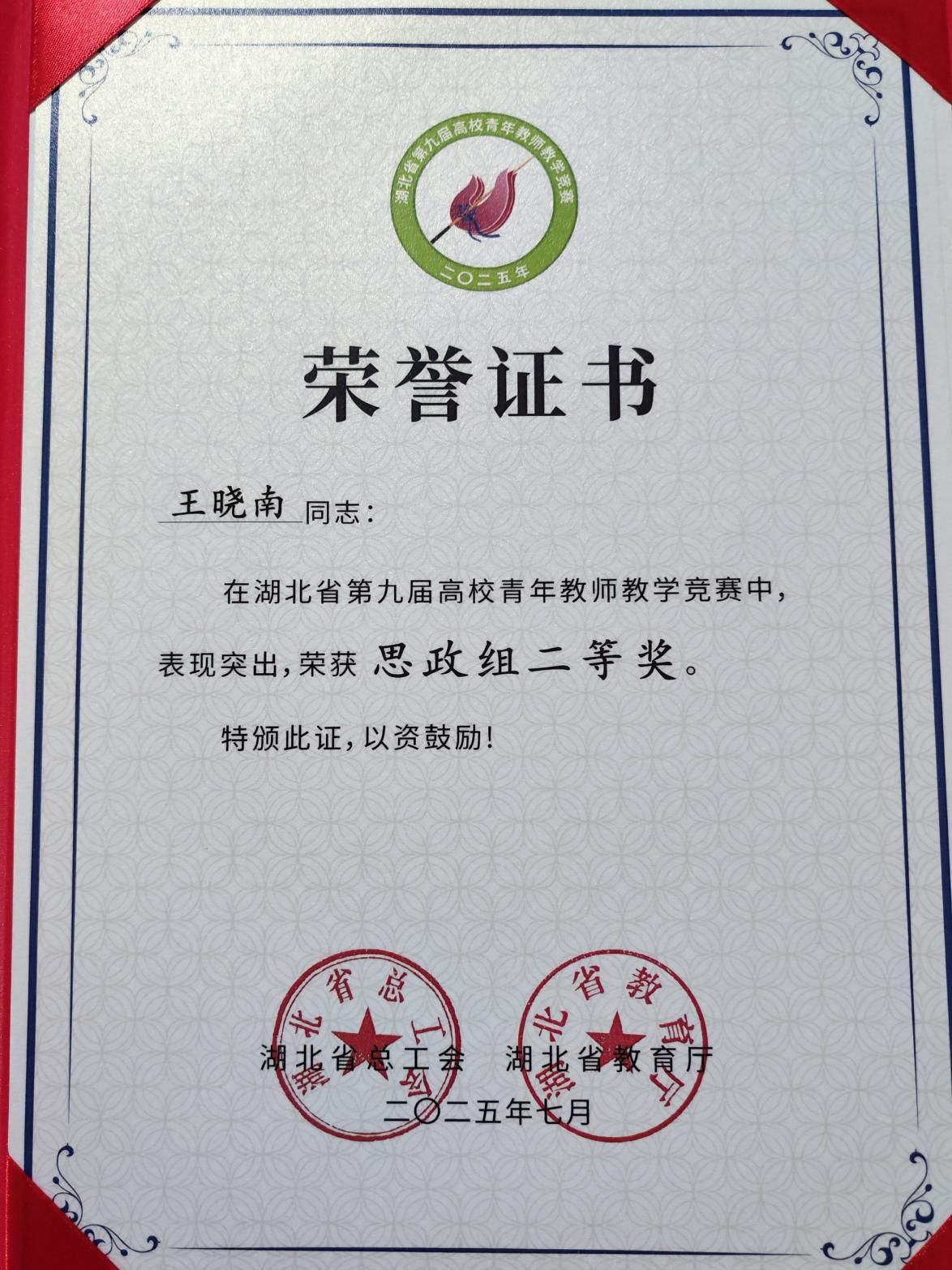 在本次竞赛中,公司青年教师王晓南经过教学设计、教学展示、教学反思三个环节的比拼,表现优异,获得思政组二等奖第一名的佳绩。这是公司教师在湖北省高校青年教师教学竞赛中取得的最好成绩,实现了历史性突破。