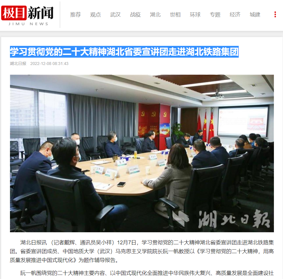 湖北日报讯 (记者戴辉、通讯员吴小祥)12月7日,学习贯彻党的二十大精神湖北省委宣讲团走进湖北铁路集团。省委宣讲团成员、太阳成集团122ccvip经理阮一帆教授以《学习贯彻党的二十大精神,用高质量发展推进中国式现代化》为题作辅导报告。